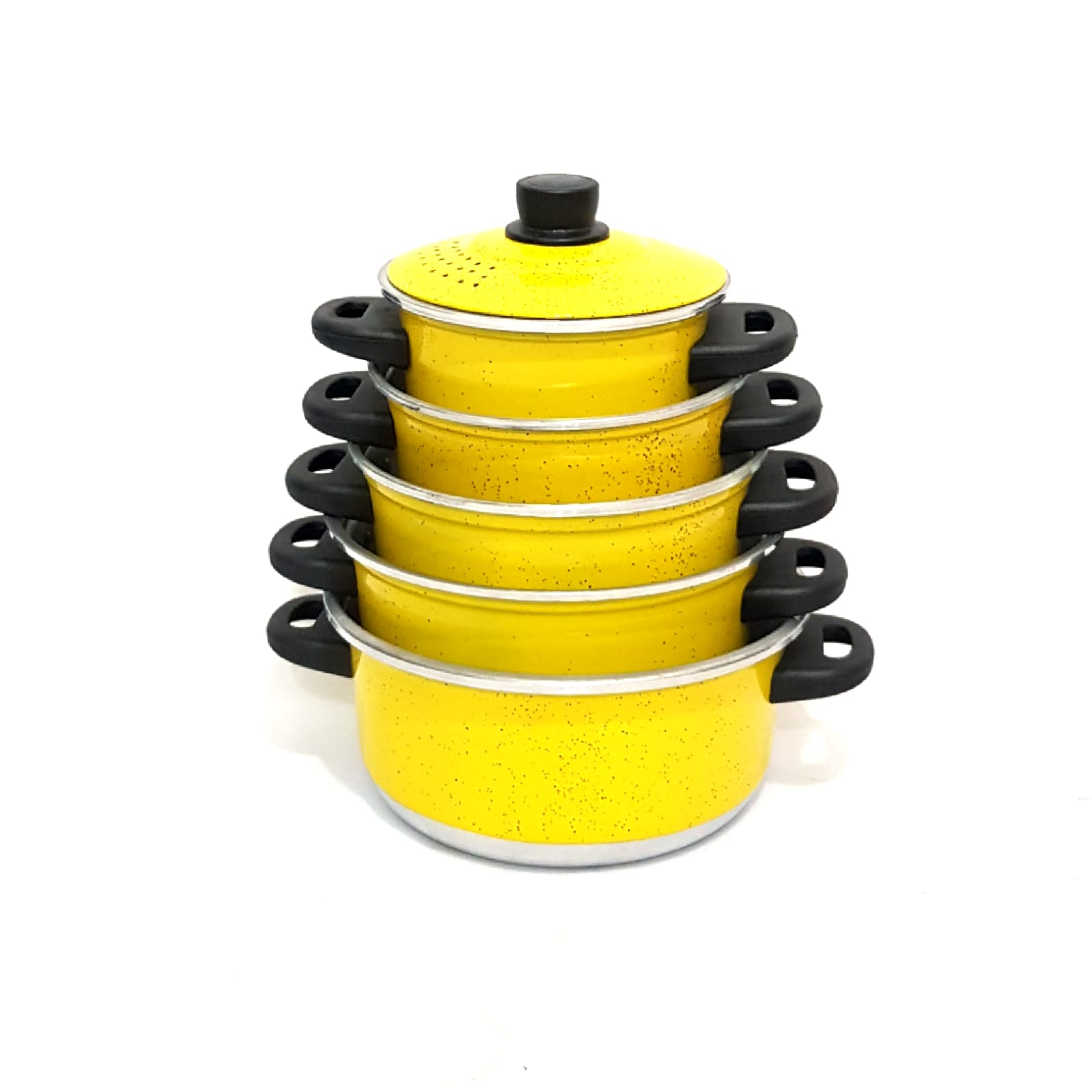 Jogo de Panela 5 Pçs Amarelo + Kit Mantimentos Alumínio 5 Pçs Maisena Amarelo + Espátulas