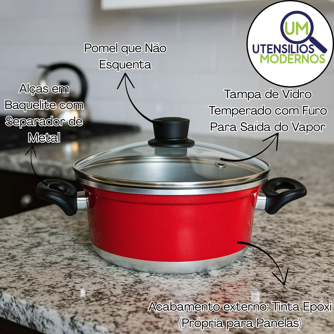 Esse jogo de panelas é produzido em alumínio de alta qualidade, garantindo aquecimento rápido e uniforme dos alimentos. As tampas de vidro com saída de vapor permitem acompanhar o preparo sem precisar abrir, mantendo o sabor e a textura das receitas.