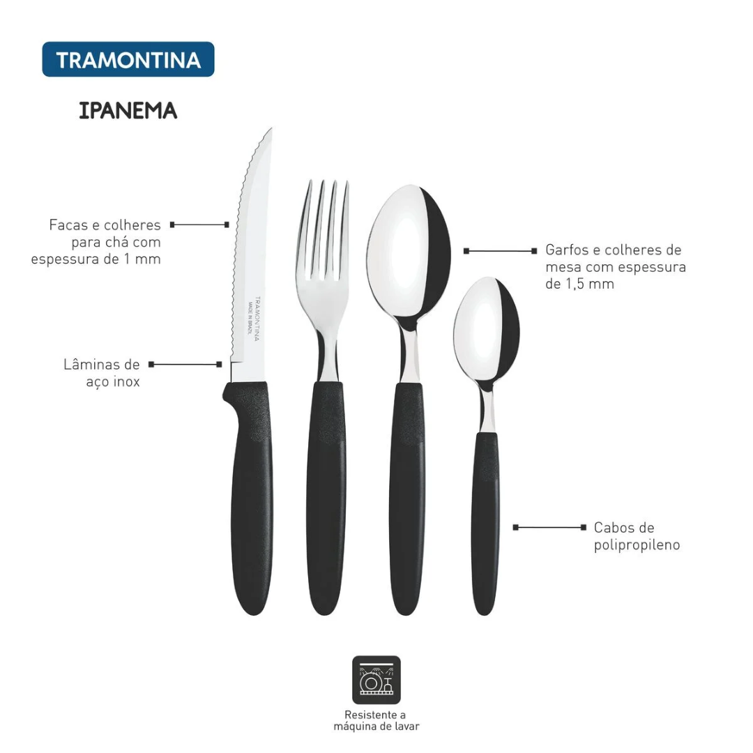 Jogo de Talheres Faqueiro 24 Peças Ipanema Preto Lâminas em Aço Inox e Cabos de Polipropileno