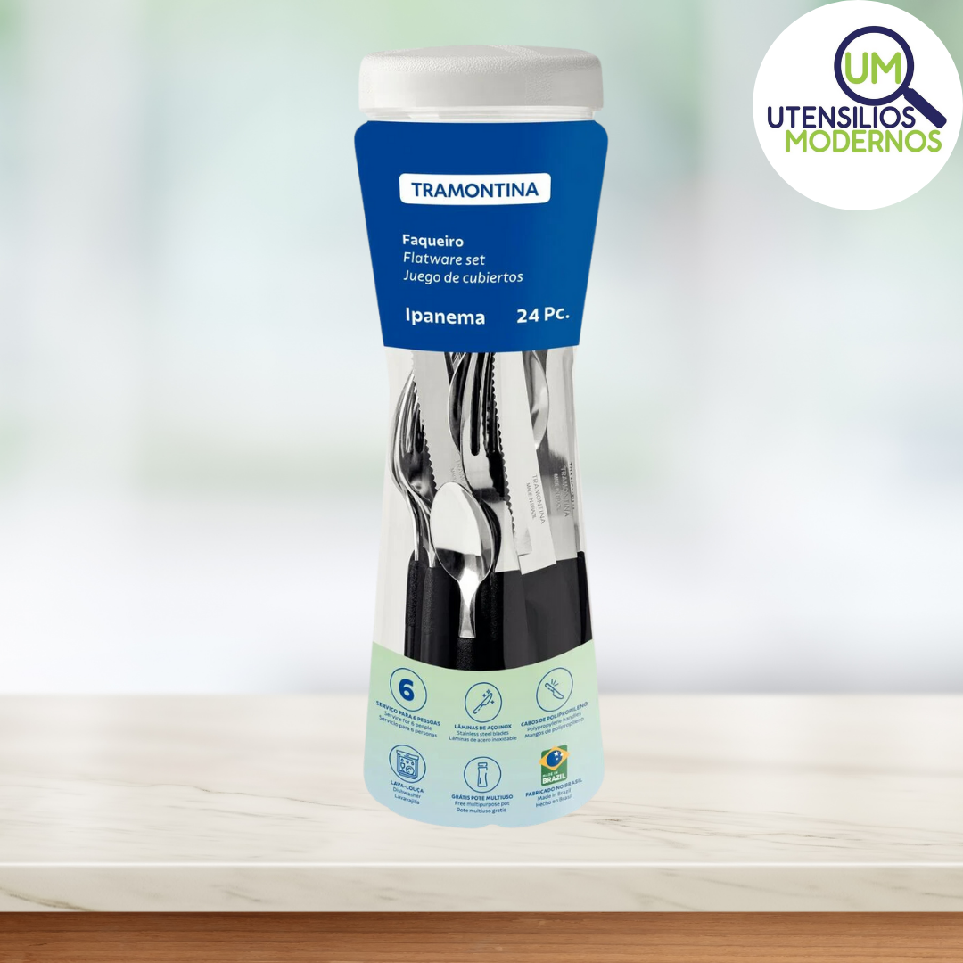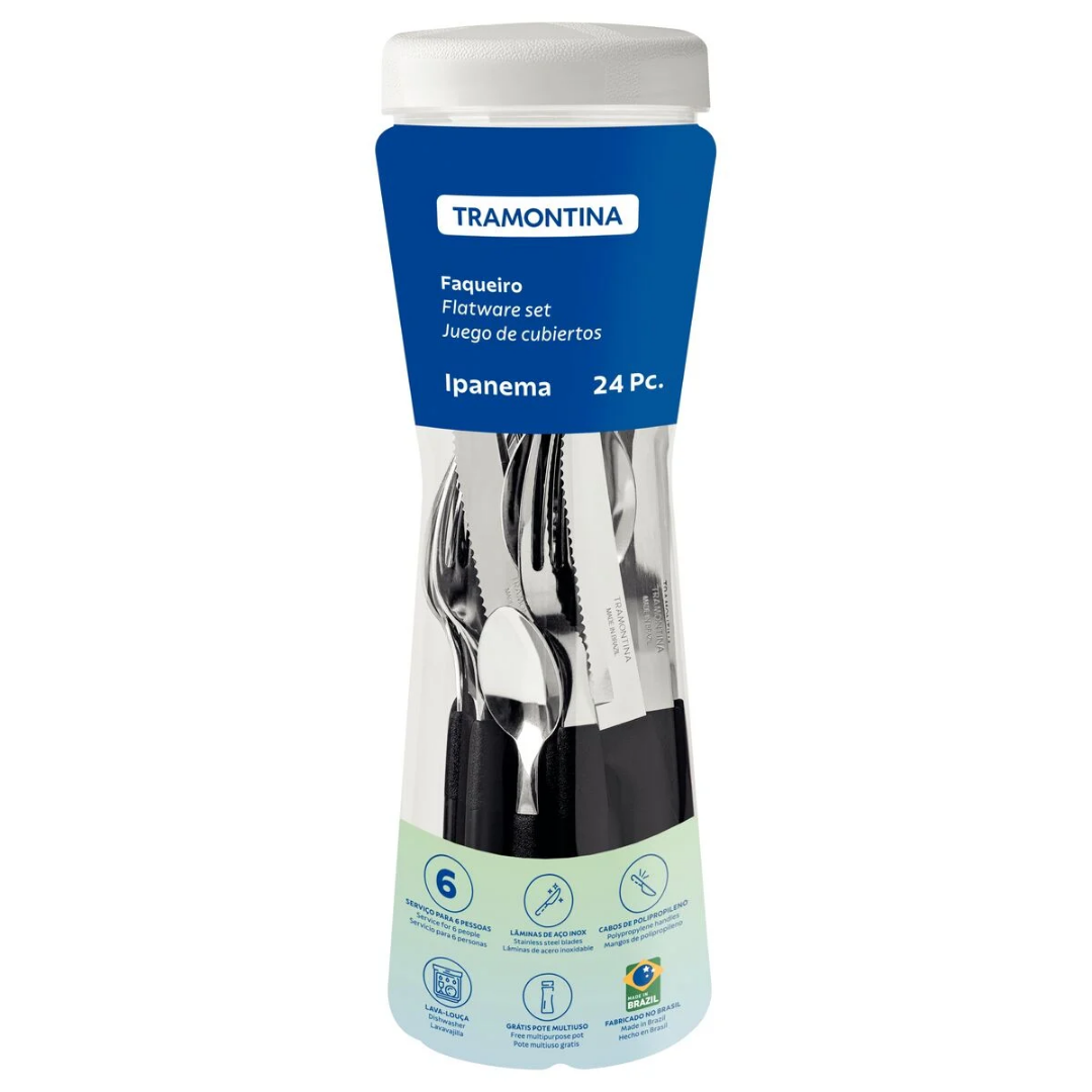 Quer uma solução prática para ter o talher certo para as mais diferentes refeições? Então conheça o Faqueiro Tramontina Ipanema com Lâminas em Aço Inox e Cabos de Polipropileno Preto com Pote Plástico 24 Peças. Um faqueiro com garfos, facas e colheres para servir da entrada à sobremesa, que tem peças produzidas com lâminas em aço inox com espessura e formatos diferenciados que garantem maior durabilidade e resistência. Os cabos são produzidos em polipropileno e garantem maior conforto no manuseio, além de deixar sua mesa muito mais moderna, devido a cor preta. Ele ainda acompanha um pote plástico, perfeito para armazenar suas peças ou alimentos como macarrão ou outros grãos. Com certeza, a escolha ideal para sua cozinha!